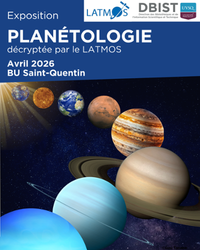 | [EXPOSITION] Planétologie à Saint-Quentin 1 avril 2026 - 30 avril 2026 Découvrez l’exposition réalisée en collaboration entre le LATMOS et les six bibliothèques de l’UVSQ, consacrée à l’astronomie. | |