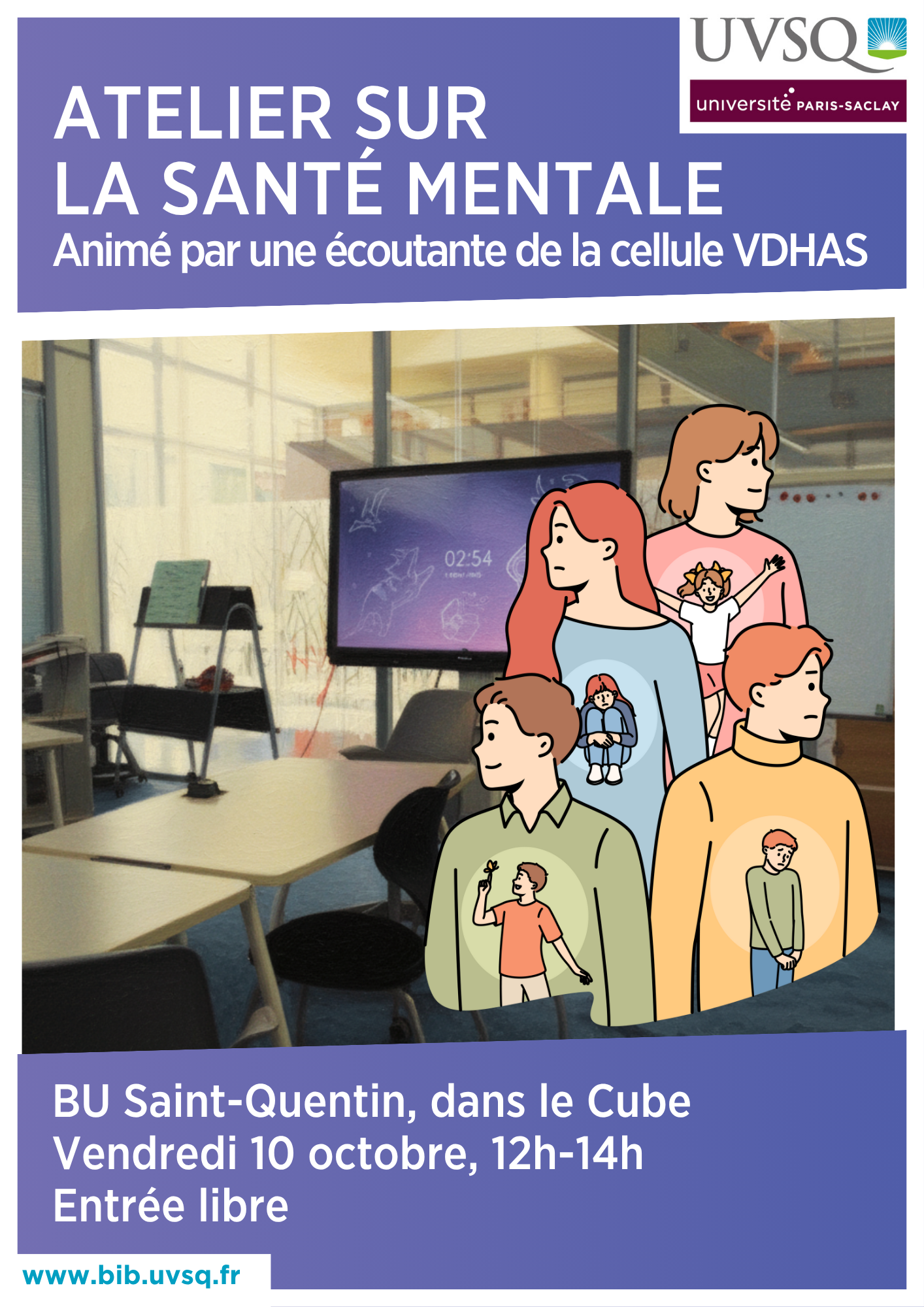 Profitez de cette table ronde pour discuter de votre santé mentale et découvrir les livres ainsi que les jeux de société mis à votre disposition par la BU de Saint-Quentin, pour prendre soin de soi. Ce moment sera dédié à aborder aussi bien les problématiques de détresse psychologique liées aux études, la dépression, que les violences sexuelles.